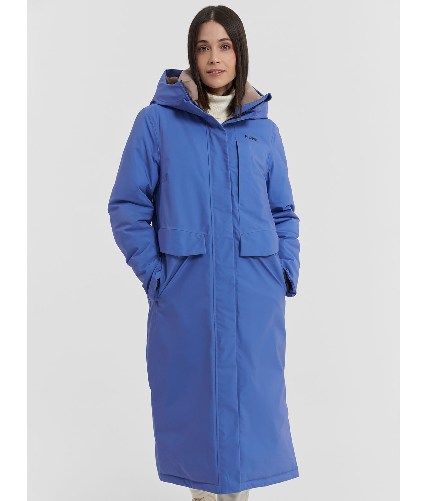 Женская зимняя удлиненная утепленная куртка с утеплителем 200 гр/м2 из мембранной ткани. Непромокаемая (уровень непромокаемости 15000 мм) и ветронепродуваемая. Паропроницаемость 10000 г/м2/24 ч